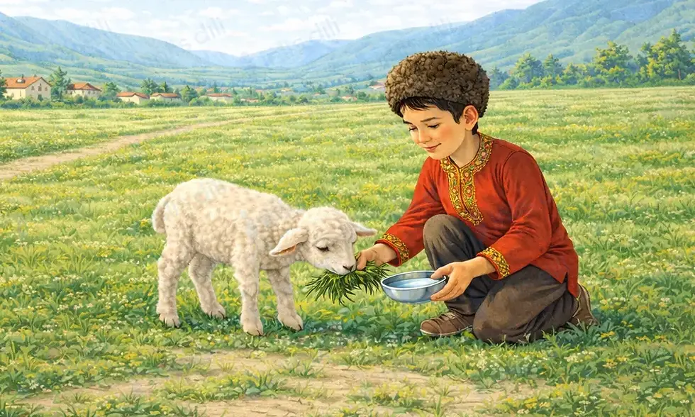 He brings some water and fresh grass. The lamb eats and feels better. Azat smiles and stays near the lamb. He is kind and careful with animals.